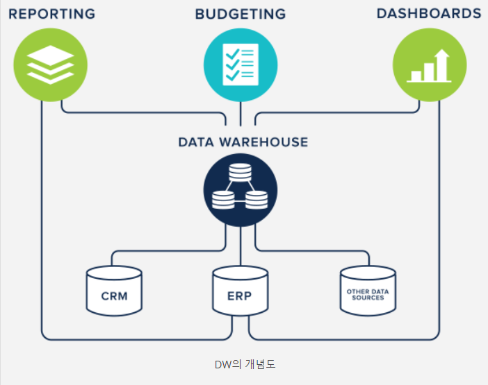 전통적인 엔터프라이즈 IT 환경에서는 '데이터 분석'을 하기 위해서는 데이터웨어하우스(DW, Data Warehouse) 시스템이 필요했습니다. 데이터창고(Data Warehouse)라는 이름에서 알수 있듯이 데이터를 저장해두는 것이 DW(Data Warehouse)의 목적이다. 전사적자원관리(ERP), 고객관계관리(CRM), 공급망관리(SCM) 등 기업에서 활용되는 다양한 시스템에서 생성되는 데이터를 DW에 담아두고, 데이터 분석이 필요할 때마다 이 창고의 데이터를 대상으로 분석을 하자는 접근이었다.